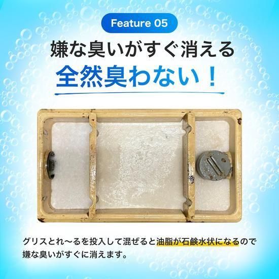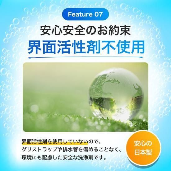 ✅界面活性剤を使用していないので、グリストラップや排水管を傷めることなく環境もに配慮した安心安全な日本製の洗浄剤です。