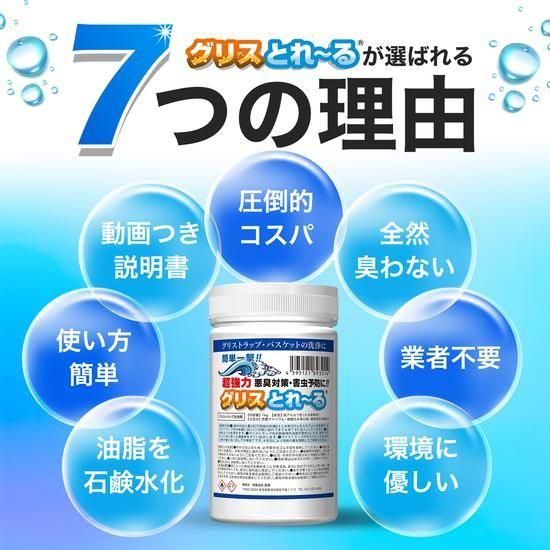 ✅動植物性油脂を石鹸水化することにより、わずかな時間で嫌な臭いも消えてグリストラップ内やバスケットに付着した汚れを、簡単に除去できます。